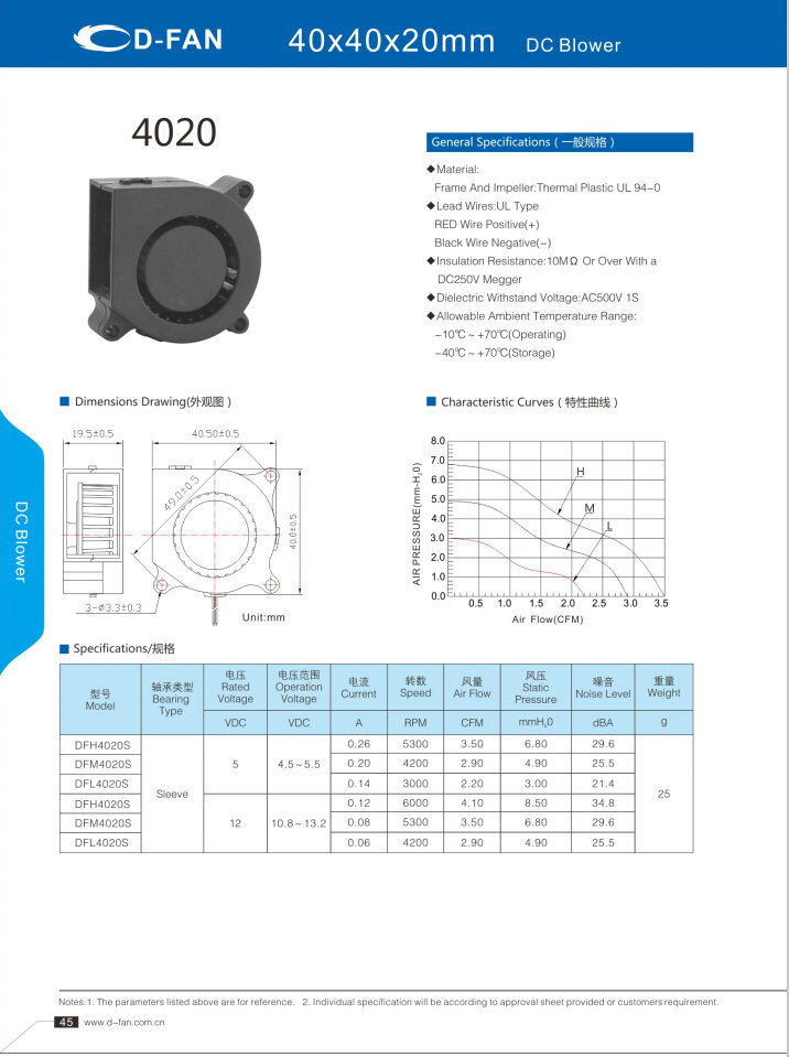 材料: 框架和叶轮:热塑UL 94-0 引线:UL型 红线正极(+) 黑线负极(-) 绝缘电阻:10MΩ或以上,带DC250V高阻表 介质耐压:AC500V 1S 允许环境温度范围: -10℃~+70℃(运行) -40℃~+70℃(储存)